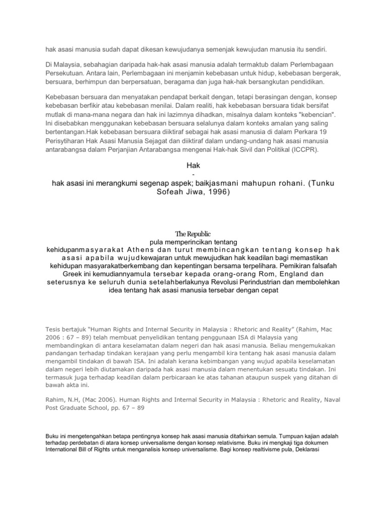 Ada perbedaan yang mendasar antara konsep ham menurut islam dan konsep ham menurut barat. Nilai praksis pancasila senantiasa berkembang dan selalu dapat dilakukan perubahan dan perbaikan sesuai dengan perkembangan. Dan diperkukuh oleh mahkamah agung didalam kes pendakwa raya v pung chen choon 10. Makalah kewarganegaraan tentang hak asasi manusia. Kumpulan hak asasi manusia dan kerajaan asing pada umumnya kritikal terhadap kerajaan malaysia dan polis diraja malaysia.