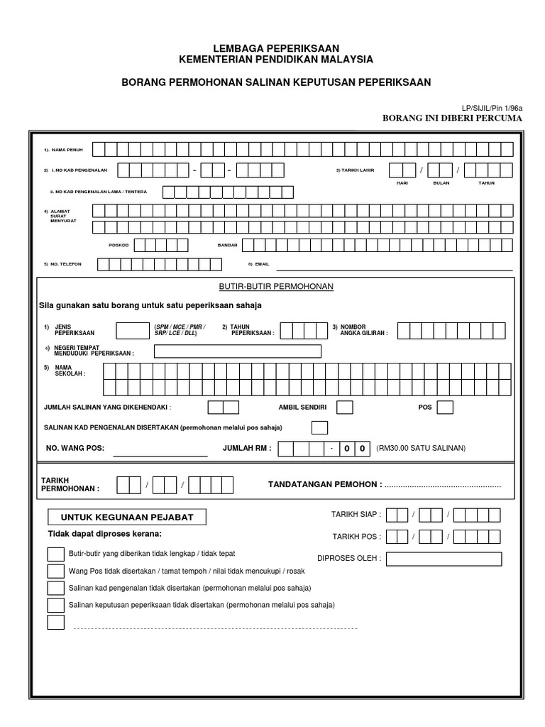 Related : Borang Permohonan Salinan Keputusan Peperiksaan : E Lembaga Peperiksaan Permohonan Salinan Sijil Peperiksaan Semak Semula Status Exam Keptennews Com / Dapatkan borang permohonan salinan keputusan peperiksaan (borang lp/sijil/pin 1/96a) dan isikan dengan lengkap..